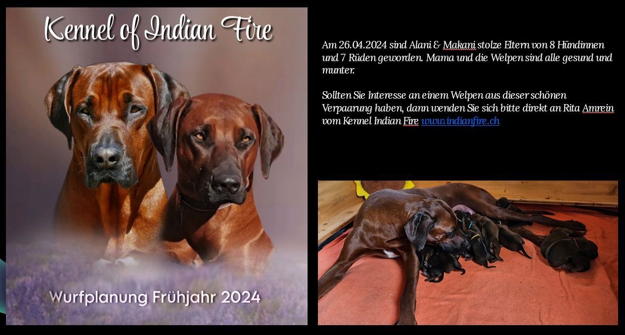 Sollten Sie Interesse an einem Welpen aus dieser schönen Verpaarung haben, dann wenden Sie sich bitte direkt an Rita Amrein vom Kennel Indian Fire www.indianfire.ch